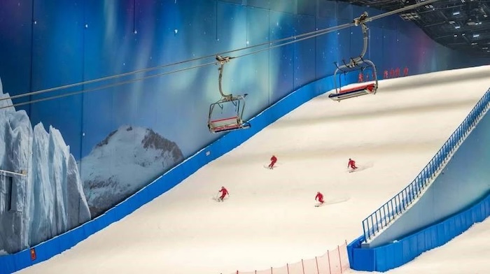 The Yaoxue Ice and Snow World project is the first major sports and tourism project to start construction after the establishment of the Lingang New Area. Its ski resort has a vertical drop of 60 meters and is equipped with three ski slopes: advanced, intermediate, and S-shaped. The overall design is mainly based on Nordic style elements, in addition to over 20 snow entertainment projects and the first indoor snow train in China.