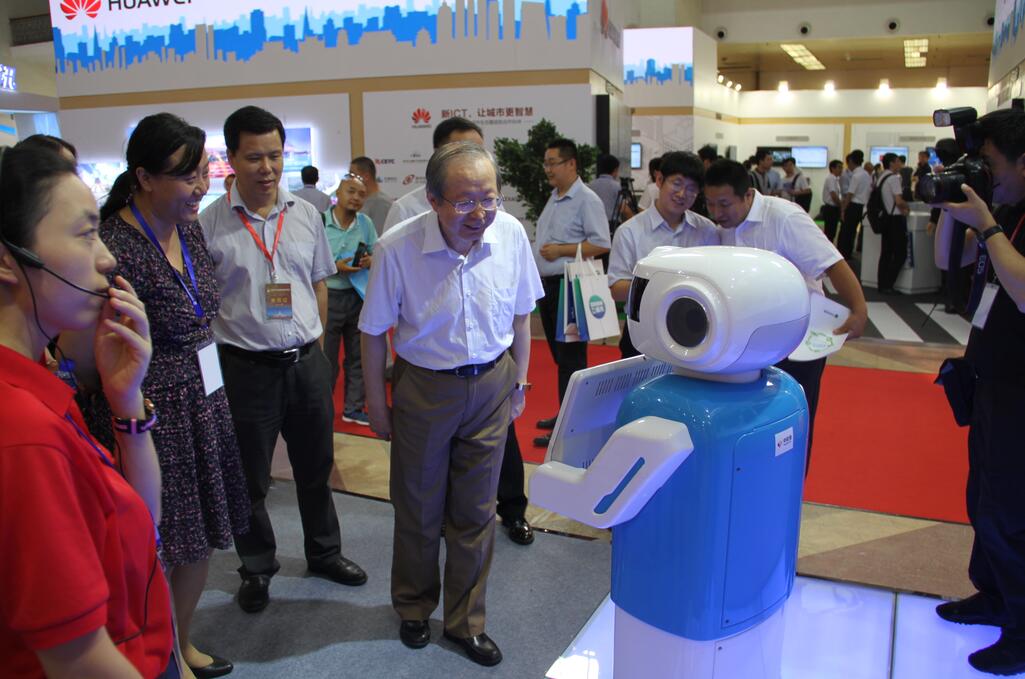中安消技術(shù)商務(wù)中心總經(jīng)理王曉娣女士(左二)陪同原發(fā)改委副主任彭森先生(左四)參觀中安消展臺(tái)