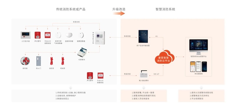 豪恩傳統消防改造系統通過用戶傳輸裝置將傳統消防主機的報警信息實時上傳到智慧消防綜合管理平臺,打通數據壁壘,共享數據及信息,化被動發(fā)現險情為主動監(jiān)測險情,提升感知預警能力與應急指揮能力,加快智慧消防工程建設。