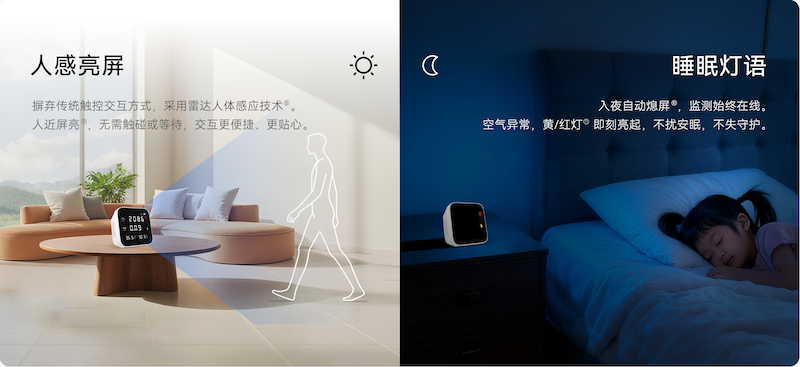 作為首款采用雷達(dá)人體感應(yīng)方案的空氣質(zhì)量檢測儀,為用戶提供了“人近亮屏、人走熄屏”的人性化無感交互體驗(yàn),大幅提升了產(chǎn)品使用的便捷性。屏幕隨人明滅,拒絕過多的光源分散注意力,助力打造輕松舒適的居家氛圍。