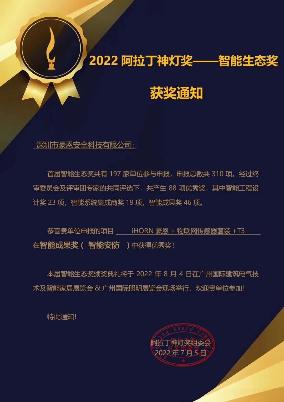 8月4日,豪恩物聯(lián)網(wǎng)傳感器T3系列榮獲“2022阿拉丁神燈獎——智能生態(tài)獎”此前,T3也曾斬獲德國紅點設計大獎是一套顏值與科技并存、品質(zhì)與性能齊驅(qū)的產(chǎn)品。