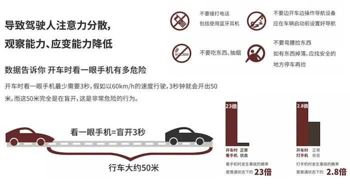 開車需要全神貫注,若開車玩手機(jī),視線離開了道路,從意識到危險發(fā)生時,把視線從手機(jī)轉(zhuǎn)移路面,加上反應(yīng)時間和制動過程,往往會出現(xiàn)追尾以及交通安全事故的情況。