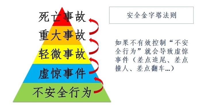 要預(yù)防死亡事故,必須預(yù)防重大事故;預(yù)防重大事故,必須預(yù)防輕微事故;預(yù)防輕微事故,必須消除日常駕車的不安全行為。
