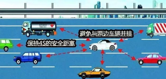 在駕駛過程中,可能會遇到前車突然停止、左右車道車輛突然變道的情況,所以要與前車保持至少4秒的安全距離。同時避免車輛并排行駛,使自己的車在前方或左、右至少一側(cè)留出空間,作為應(yīng)急逃生區(qū)。