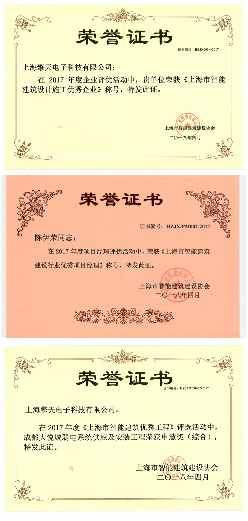2018年6月25日,上海市智能建筑建設(shè)協(xié)會評優(yōu)公布。經(jīng)過現(xiàn)場初評、專家評審以及社會評議,中安科股份成員企業(yè)上海擎天電子科技有限公司(簡稱上海擎天)共摘得三項大獎,分別是上海市智能建筑設(shè)計施工優(yōu)秀企業(yè)獎、上海市智能建筑優(yōu)秀工程-申慧獎綜合獎及上海市智能建筑建設(shè)行業(yè)優(yōu)秀項目經(jīng)理獎。