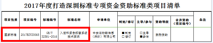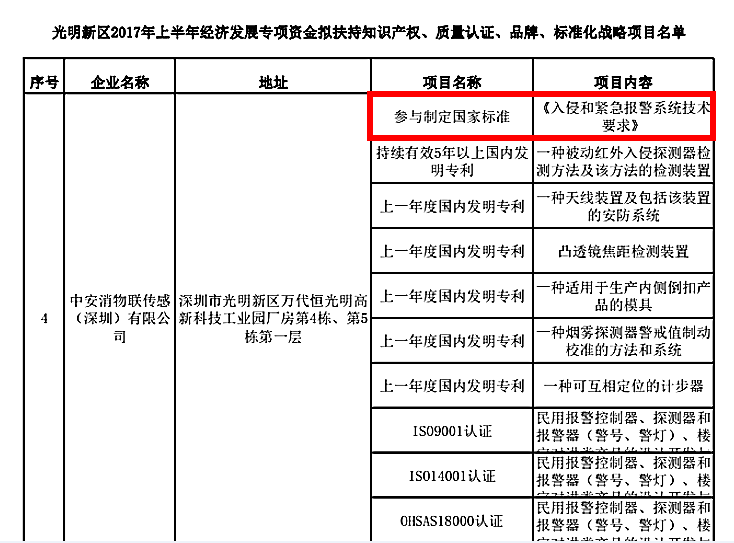 作為國(guó)家級(jí)高新技術(shù)企業(yè)及深圳市戰(zhàn)略性新興企業(yè),中安消物聯(lián)傳感(深圳)有限公司(原深圳市豪恩安全科技有限公司)高度重視標(biāo)準(zhǔn)化、體系化建設(shè)。因在國(guó)家標(biāo)準(zhǔn)制定方面所取得的突出成果,中安消物聯(lián)傳感獲得2017年度打造深圳標(biāo)準(zhǔn)和光明新區(qū)2017年上半年經(jīng)濟(jì)發(fā)展兩級(jí)政府專項(xiàng)資金的支持。