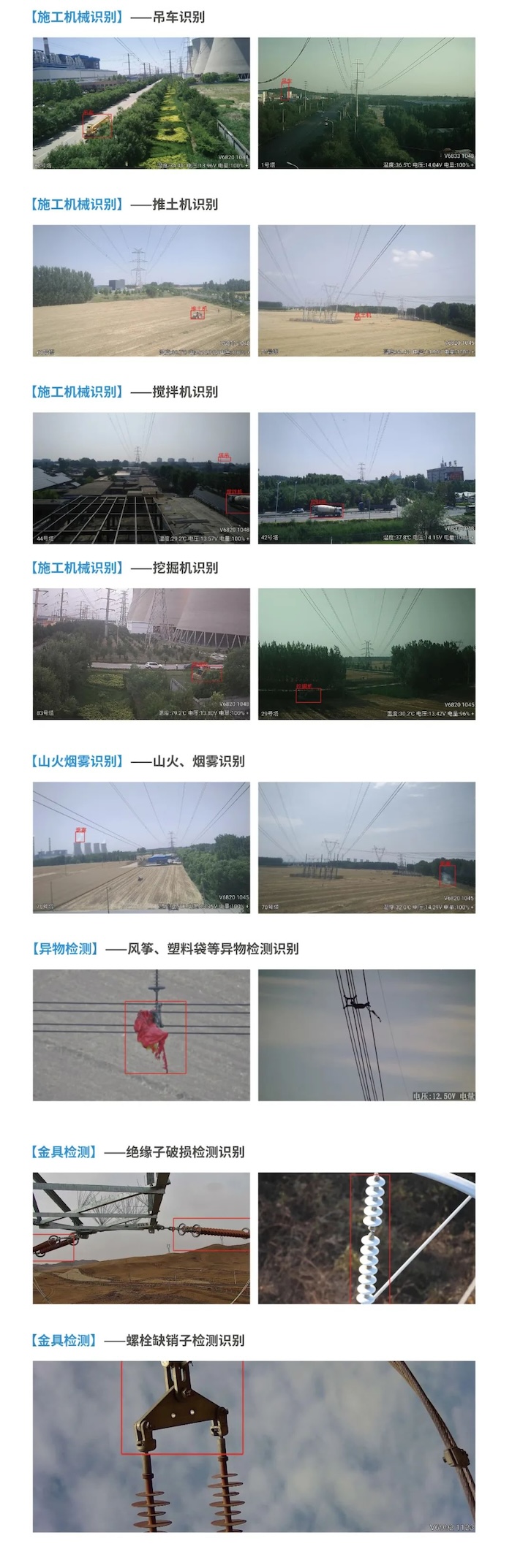 明景輸電線路在線監(jiān)測(cè)系統(tǒng)前端可實(shí)現(xiàn)對(duì)施工機(jī)械(吊車、推土機(jī)機(jī)、攪拌機(jī)等)、山火煙霧、異物、金具等進(jìn)行檢測(cè)識(shí)別等。全天候常態(tài)化隱患監(jiān)測(cè),及時(shí)發(fā)現(xiàn)潛在外破隱患,提前預(yù)知及告警,提高巡檢效率,助力保障輸電線路運(yùn)行安全。